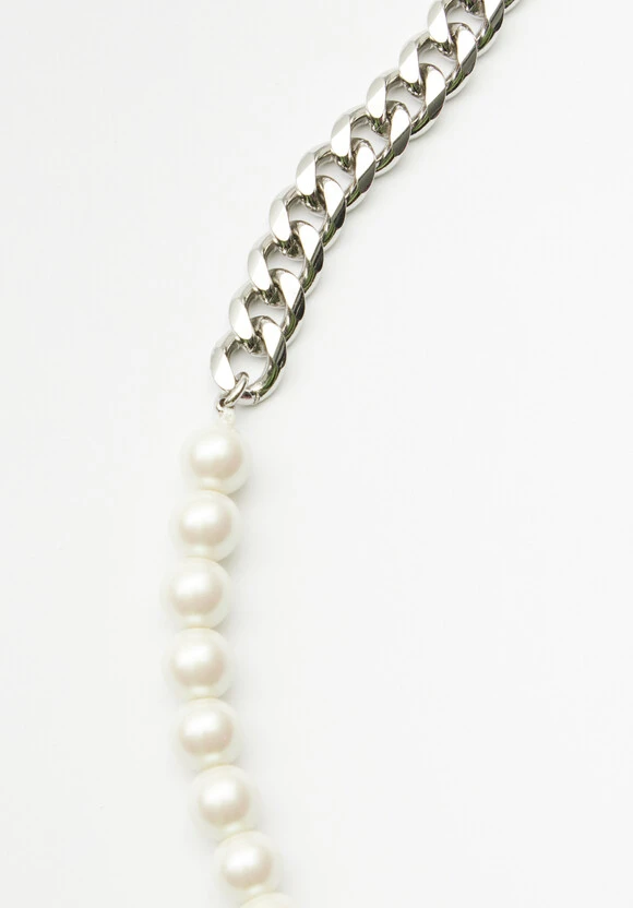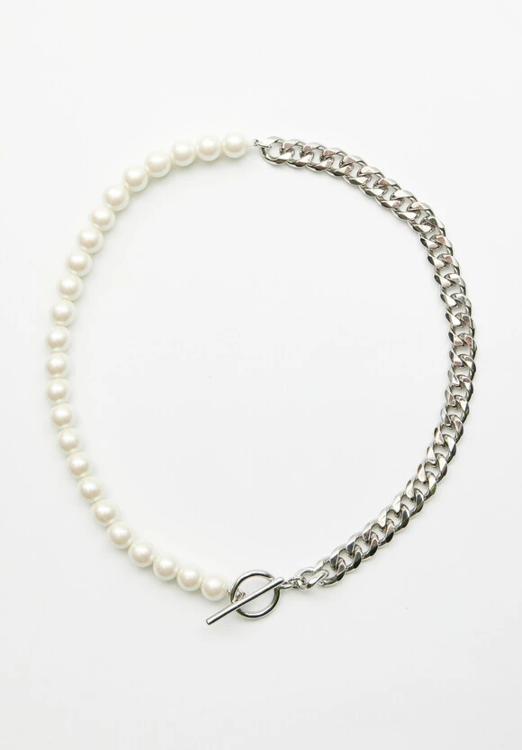 Sometimes all a simple look needs is our Harrie necklace to give it that edge. The half-and-half design feels really new – one side is a silver-plated brass chain and the other is strung with faux pearls – and it fastens with an easy toggle.