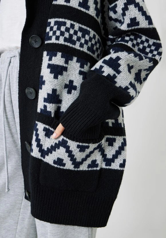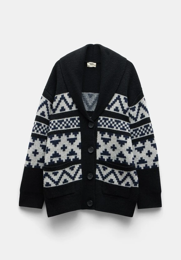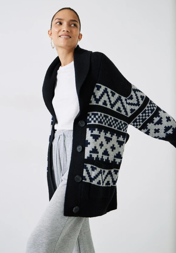 A cardi to pull on for home, work and weekends out? Our do-it-all Kellton has an ultra-slouchy fit made with hints of wool for ultimate cosiness. Its monochrome jacquard looks great with everything, by the way; throw it on over jeans or joggers and you’re all set.