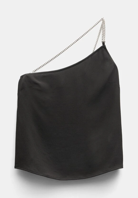 One-shoulder cuts are a great way to keep that casual, laid-back look while making it feel elevated. Our Lexie top is cut from a beautifully draped, lightweight fabric that hangs from a single chain strap at one side. Dress it down with denim.