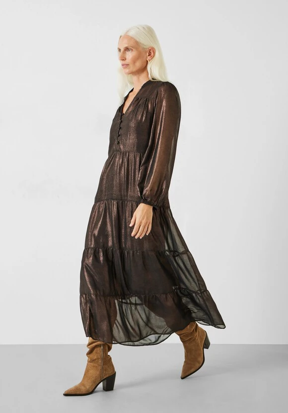 Our Abelia dress is a pretty maxi in an eye-catching bronze foil fabric: the kind that looks just as good at the office as it does at drinks parties. Fabric-covered buttons at the neck give it a feminine feel, while the tiered shape makes it easy to wear. It also happens to be made from recycled fabrics, reducing its environmental impact.