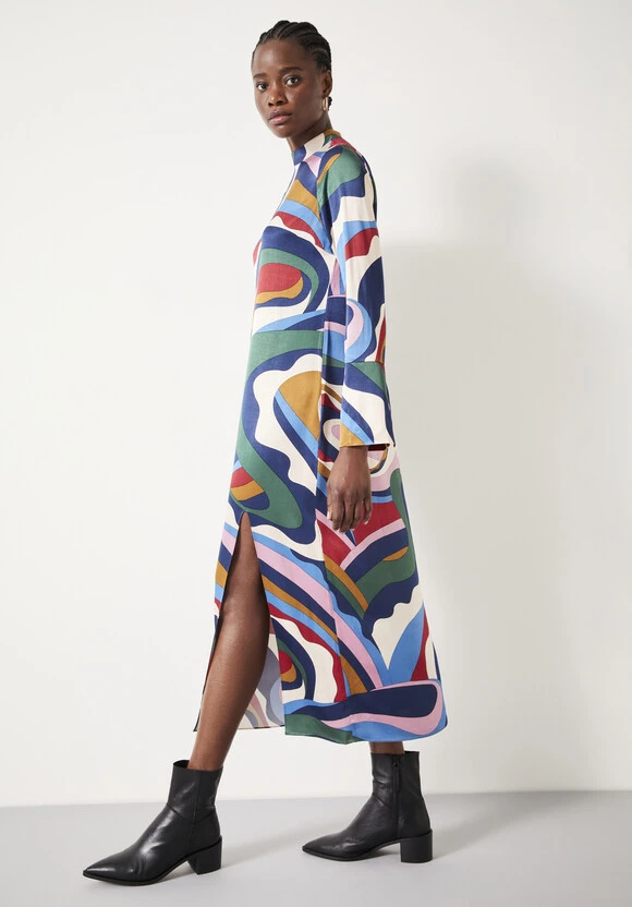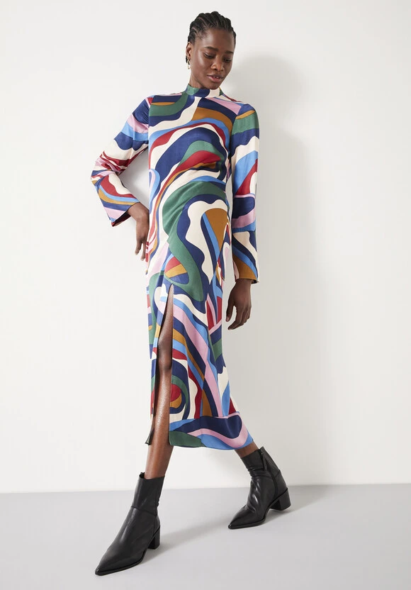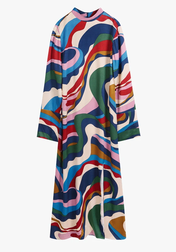 We’re always drawn to those styles that make a statement, and it doesnt get more attention-grabbing than the colourful print swirling across our Rita dress. Cut from slinky satin to form a floor-length silhouette, it’s finished with wide sleeves and a 60s-inspired mock-neck collar.